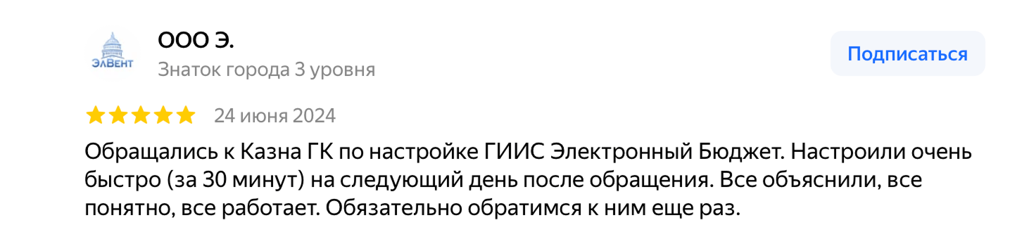 Обращались в «Казна ГК» для настройки ГИИС «Электронный бюджет». Всё сделали очень быстро (за 30 минут) уже на следующий день после обращения...