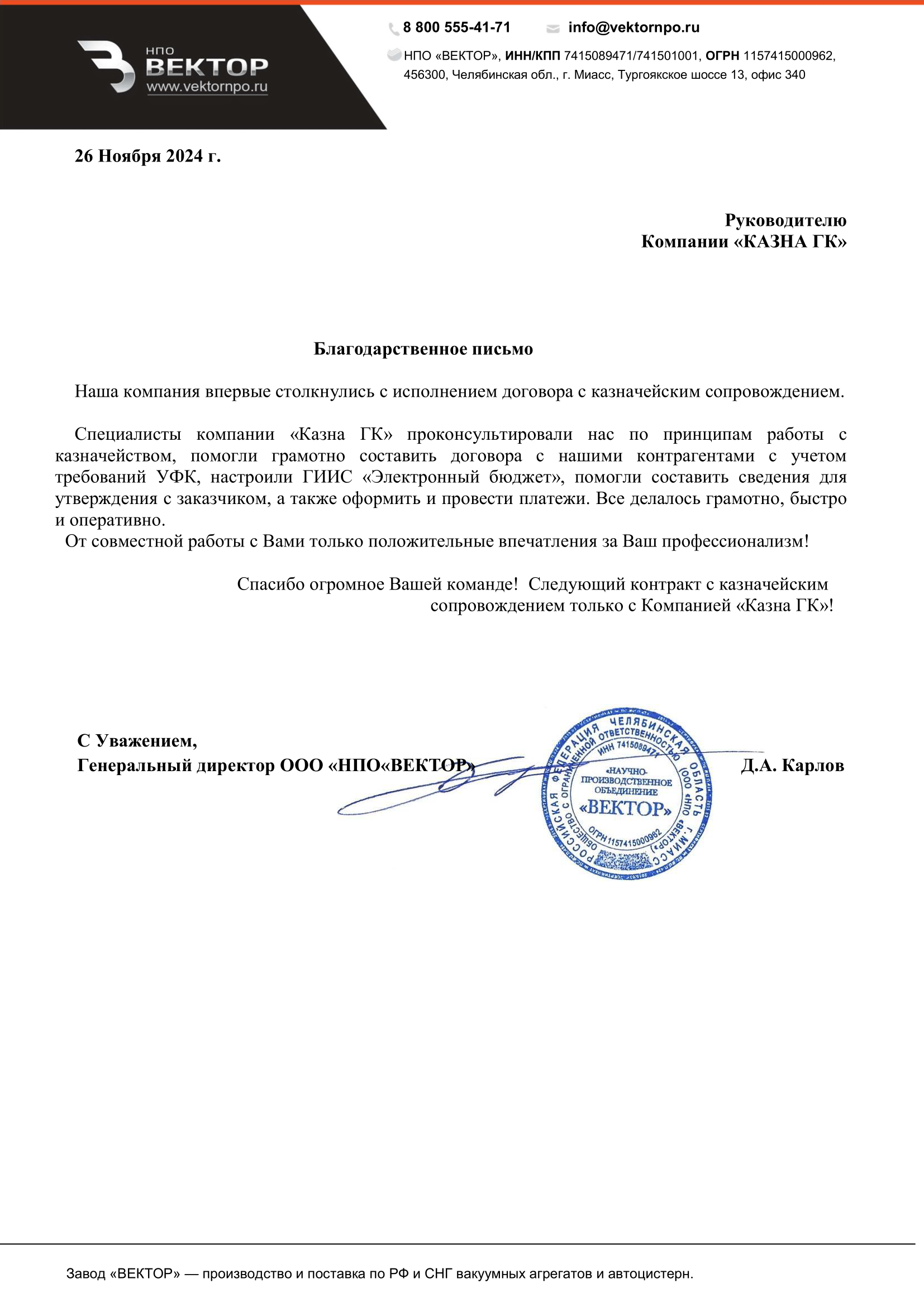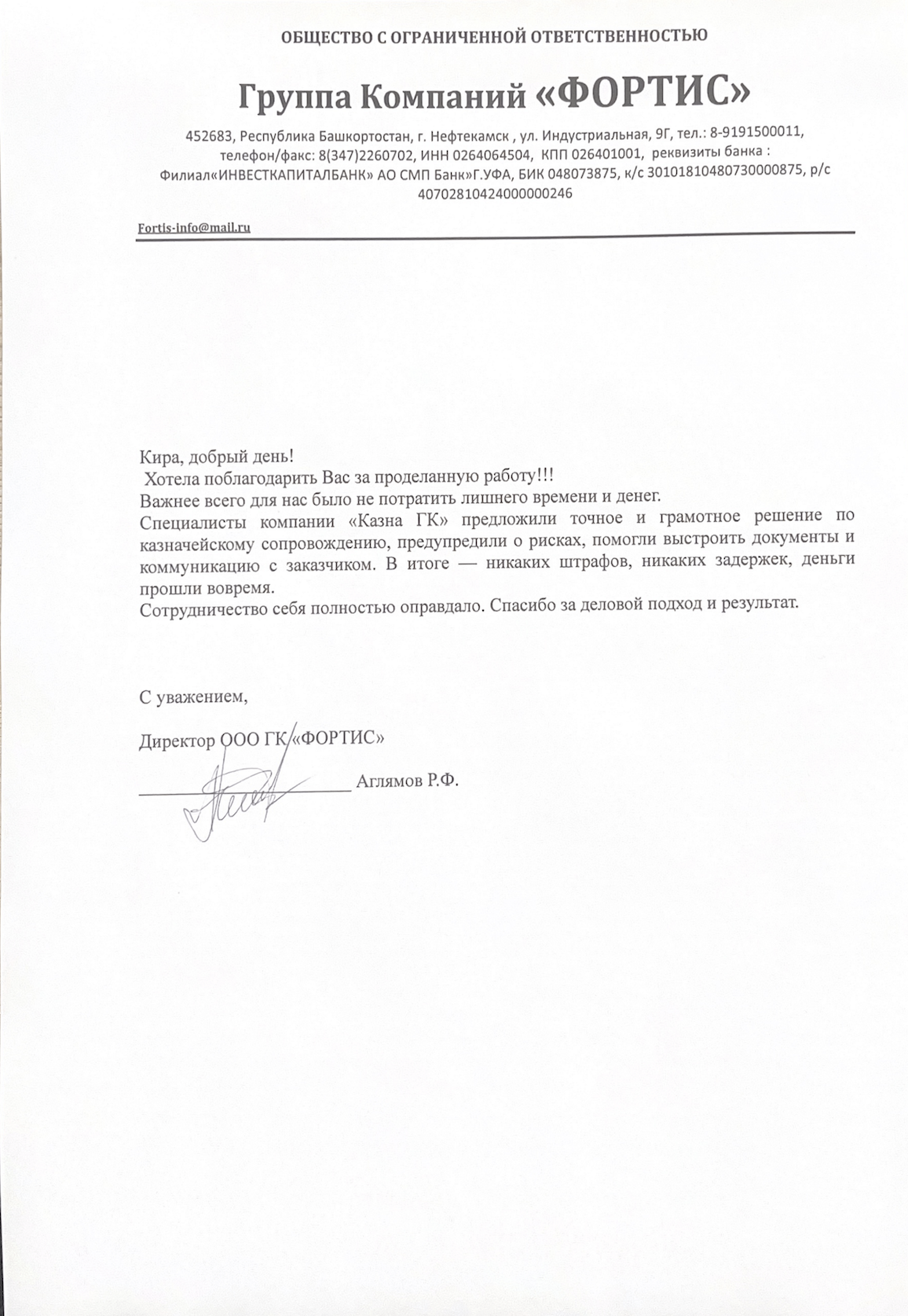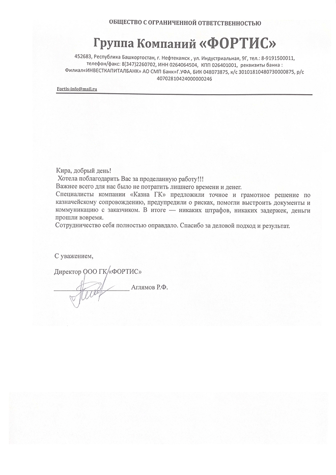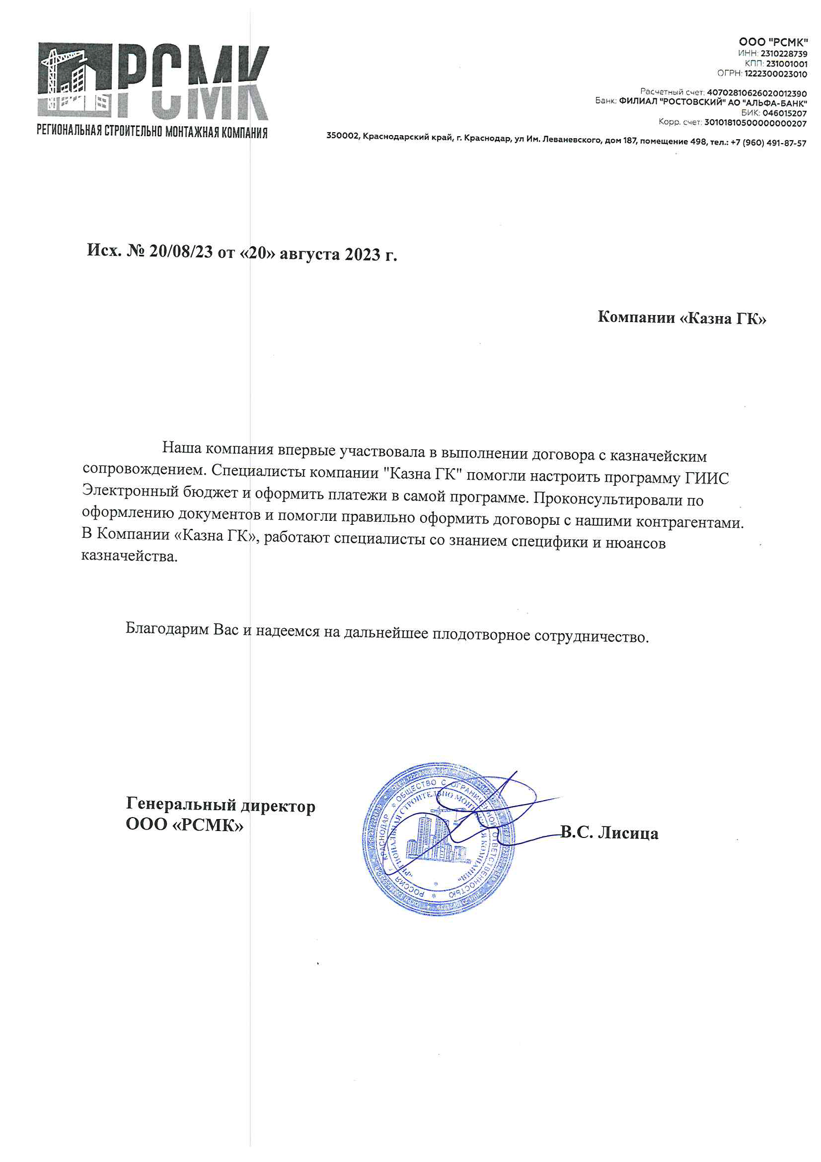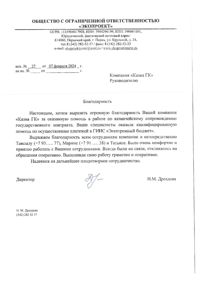 Настоящим, хотим выразить огромную благодарность Вашей компании «Казна ГК» за оказанную помощь в работе по казначейскому…