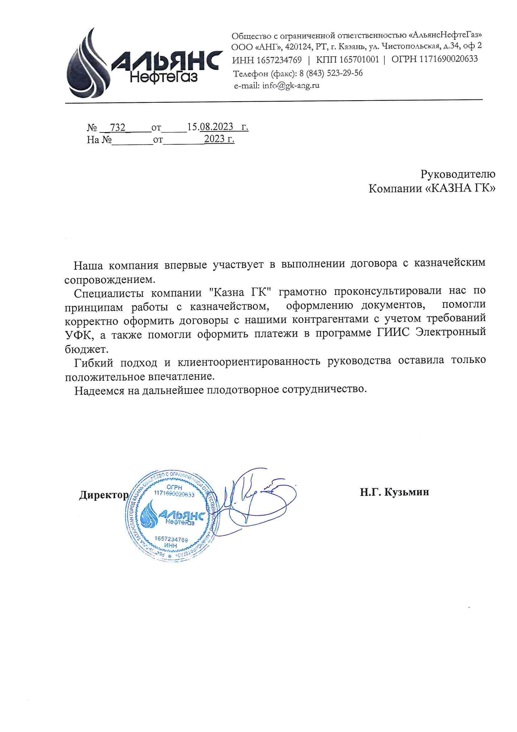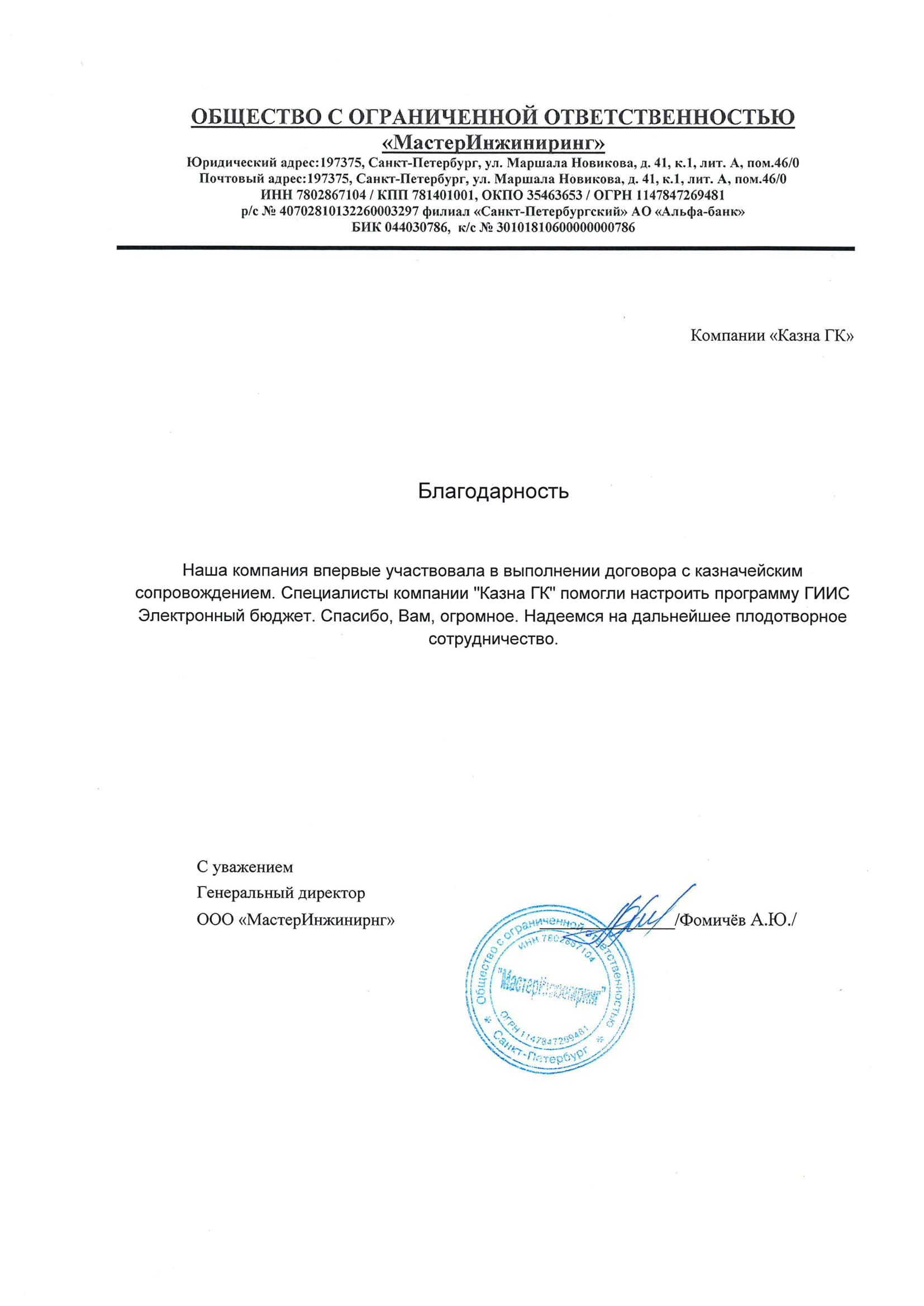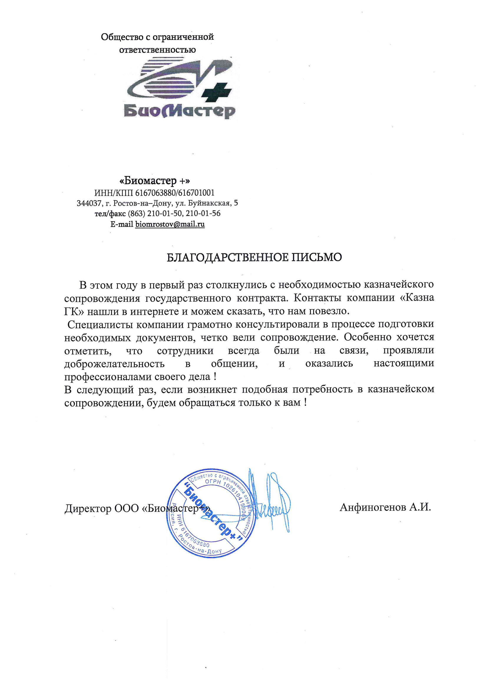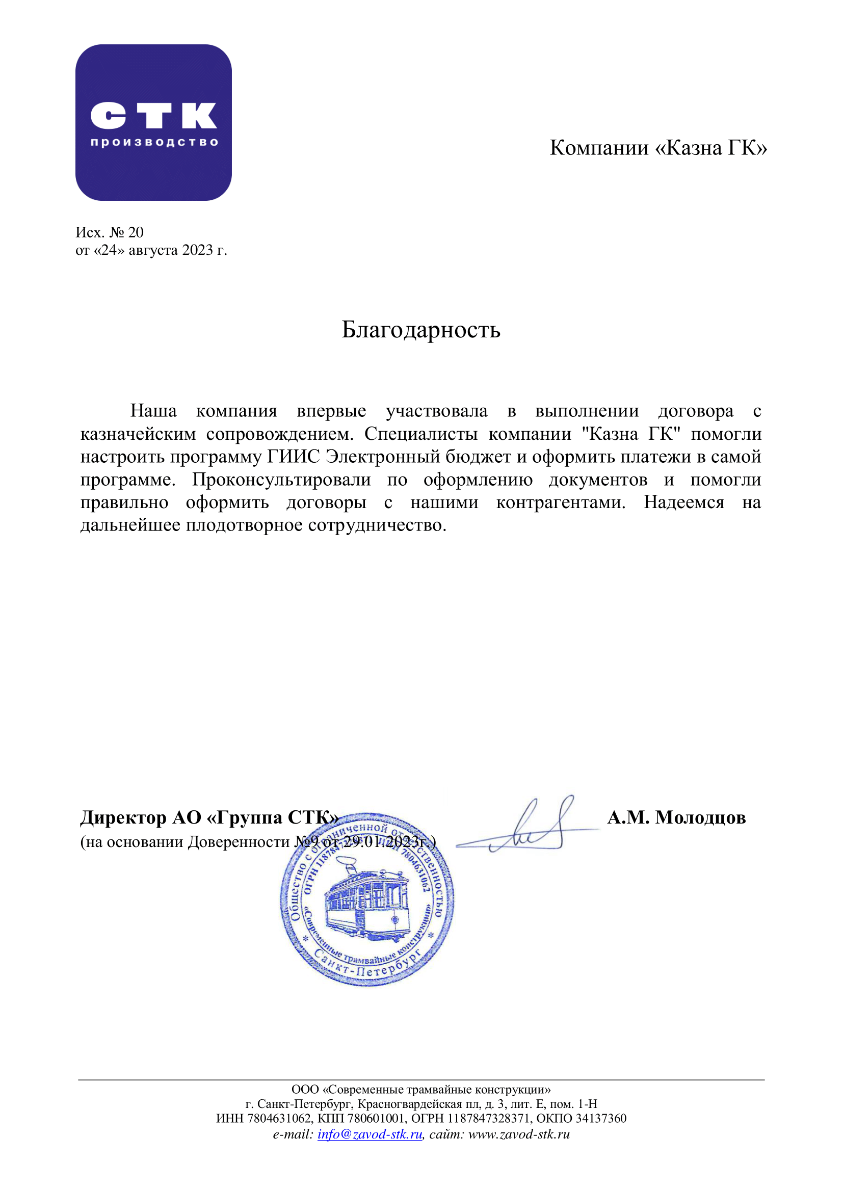 Настоящим, хотим выразить огромную благодарность Вашей компании «Казна ГК» за оказанную помощь в работе по казначейскому…